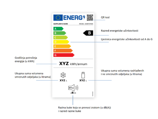 - U gornjem desnom kutu energetske oznake uvodi se QR-kod koji će pružiti izravnu vezu s bazom podataka o Europske komisije, podržavajući transparentnost i lakši nadzor tržišta od strane nacionalnih vlasti